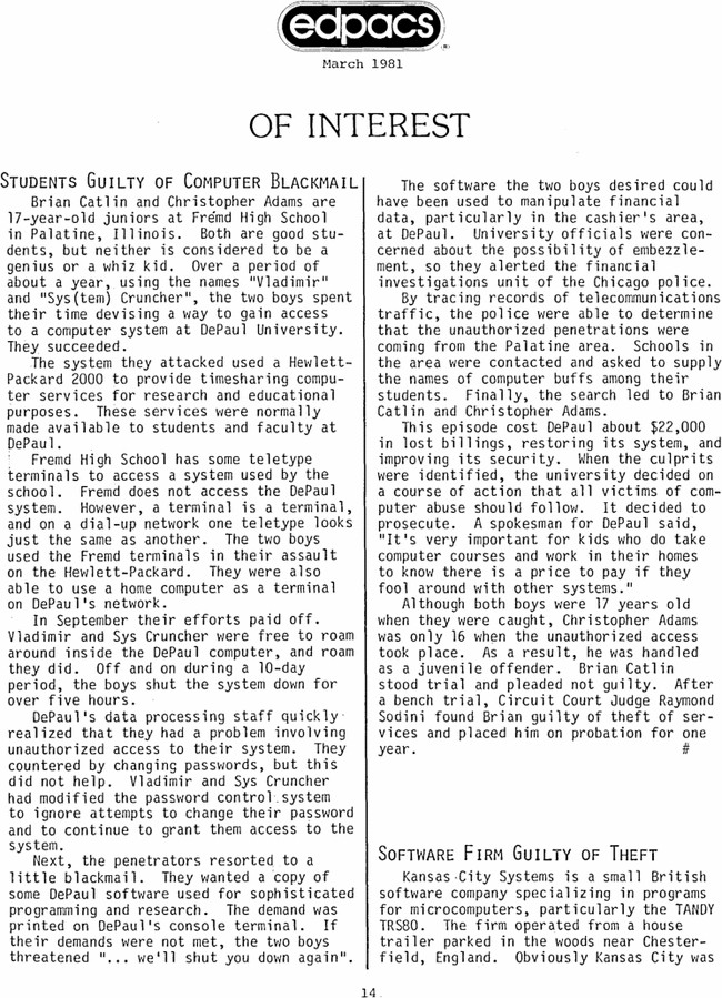 September, 1980: two Fremd High School students, Brian Catlin (“Sys Cruncher”) and Chris Adams (“Vladimir”), gained access to an HP 2000 (?) computer at DePaul University, sending messages to admin staff and demanding access to additional software. Chicago PD's new computer crime division investigated and found that the students used “teletypes” (likely DECwriter terminal(s)) at the highschool along with an Ohio Scientific micro in their homes to access the HP system.