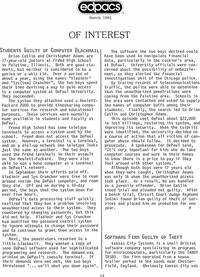 September, 1980: two Fremd High School students, Brian Catlin and Chris Adams, gained access to an HP 2000 (?) computer at DePaul University, sending messages to admin staff and demanding access to additional software. Chicago PD's new computer crime division investigated and found that the students used “teletypes” (likely DECwriter terminal(s)) at the highschool along with an Ohio Scientific micro in their homes to access the HP system.